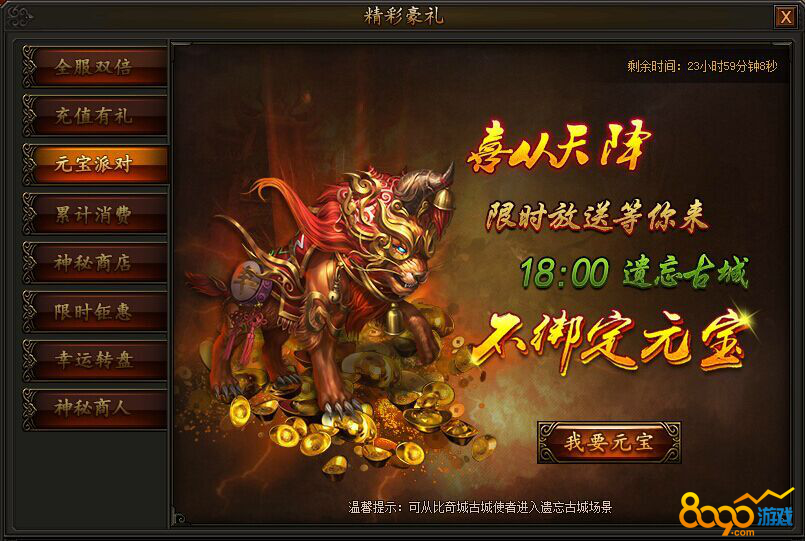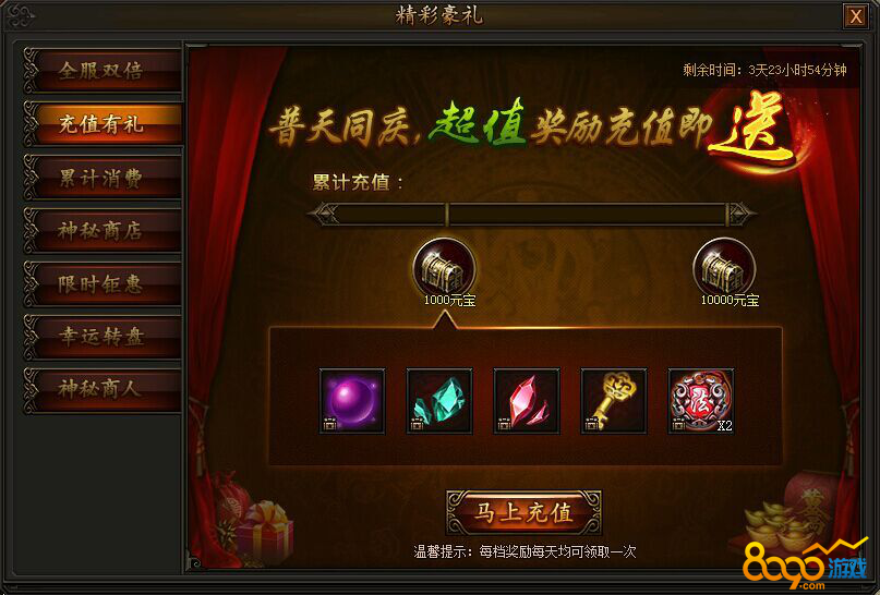 活动期间,充值元宝即可领取两档丰厚奖励,每天均可领取一次,不容错过!