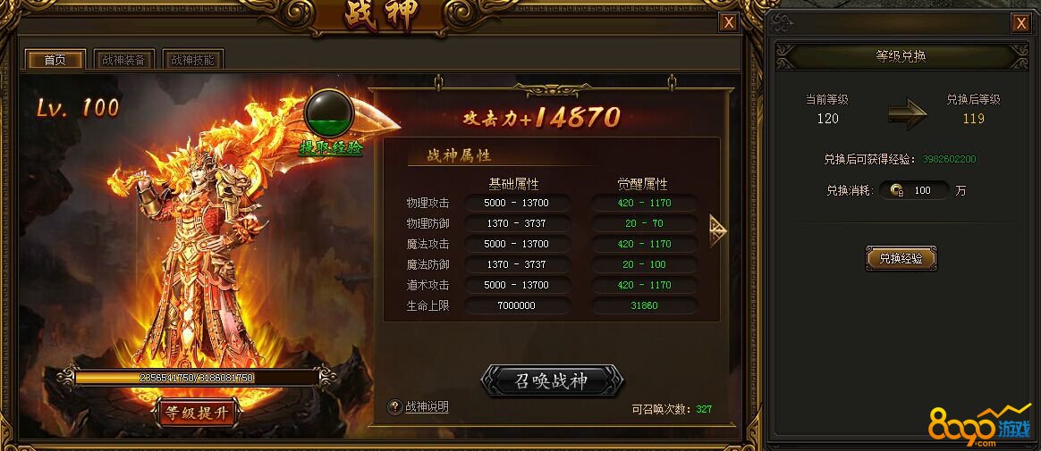 觉醒战神初始等级为80级,可通过角色降级、每日提取1次储存的打怪基础经验(不包含任何活动、经验卷轴等多倍经验加成),提升后即可获得属性效果加成。
