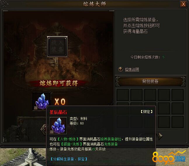 传奇霸业游戏中,玩家想要得到黑铁晶石或者是星辰晶石的时候,可以通过装备分解、挖宝或商城购买获得。
