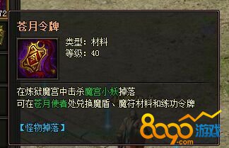击杀炼狱魔宫内的魔宫小妖可以获得苍月令牌,攒够一定数量的令牌后,即可在苍月使者处兑换魔盾和魔符材料,进一步提升护盾与血符等级,提升角色实力。