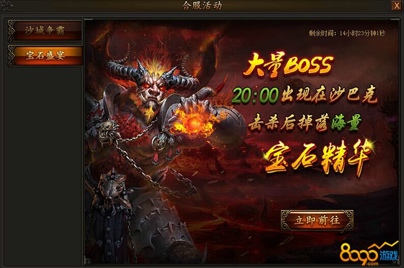 合服后,将会有持续几天的宝石盛宴的活动,大量boss将在20点出现在沙巴克,击杀后将会掉落海量的宝石精华。