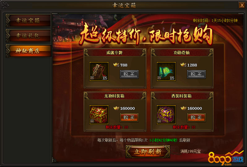 主要就是神秘商店了,神秘商店可以用绑元,绑金买道具,还能花费199元宝刷新,刷新出的物品随机,各种各样的道具层出不穷。运气好还能刷出2套高属性时装。
