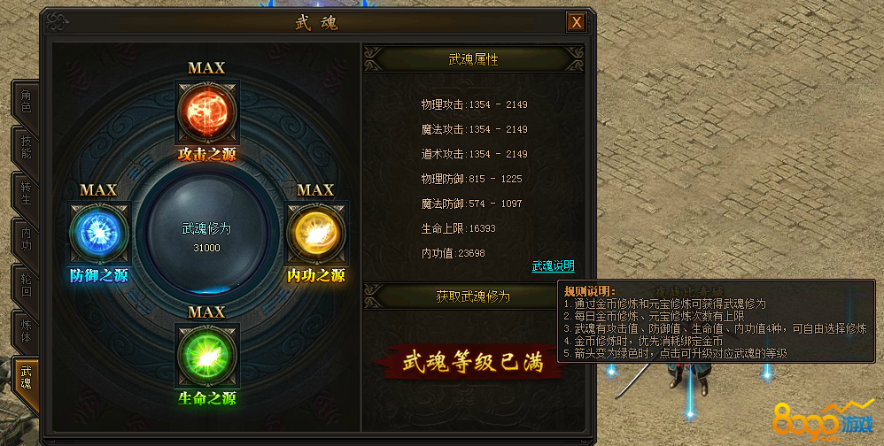 武魂分为四种,攻击之源、内功之源、生命之源、防御之源。每天可通过金币和元宝修炼获得武魂修为,每日有次数限制。武魂修为是通过日积月累来的,所以大家都一样哦。道士满武魂加的属性还是很可观的,生命1W6,内功2W3,攻击也有2100多。