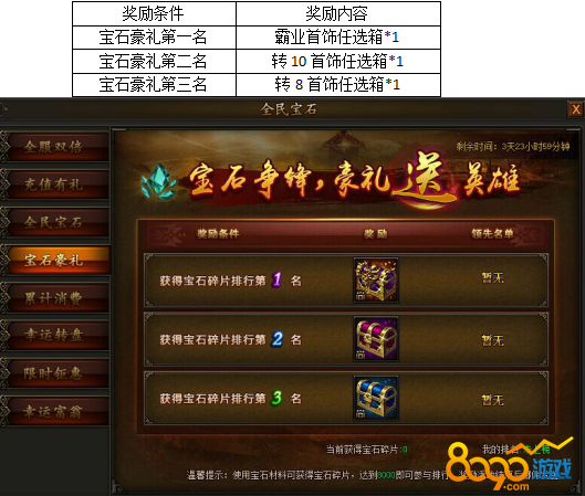 活动期间,使用宝石结晶大、中、小材料获得宝石碎片,获得碎片数目达到8000即可参与碎片获得排行,有机会获得霸业装备、极品首饰奖励!活动结束后,奖励通过邮件发送。