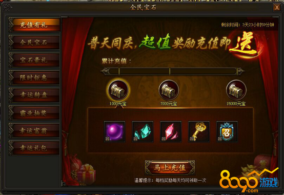 活动期间,充值元宝即可领取三档丰厚奖励,每天均可领取一次,不容错过!