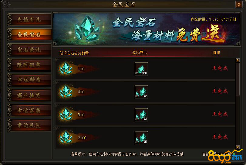 活动期间,使用宝石结晶大、中、小材料获得宝石碎片,获得的宝石碎片达到一定数量即可领取大量材料返还,获得碎片越多,返还材料越多,升级宝石事半功倍!