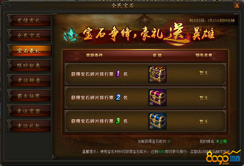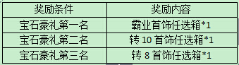 活动期间,使用宝石结晶大、中、小材料获得宝石碎片,获得碎片数目达到8000即可参与碎片获得排行,有机会获得霸业装备、极品首饰奖励!活动结束后,奖励通过邮件发送。