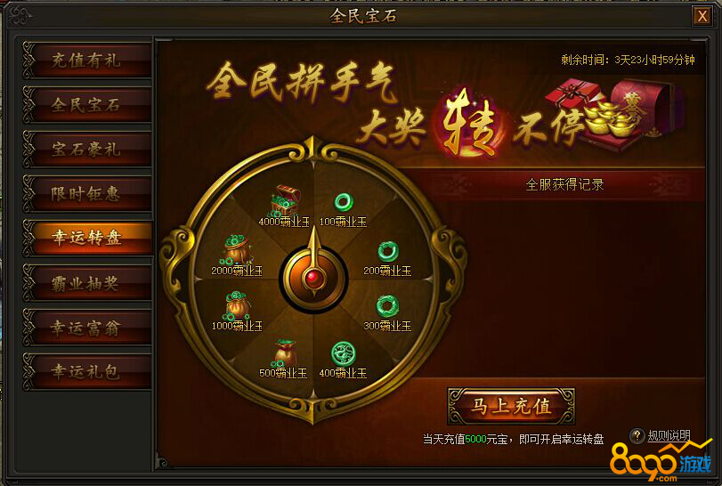 活动期间,充值并消费一定元宝即可使用幸运转盘,获得大量霸业玉道具,使用霸业玉后即可前往霸业商城内购买珍稀道具,精彩不容错过。