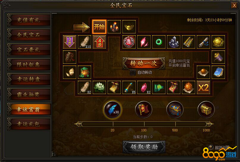 活动期间,充值一定元宝即可参与幸运大富翁,获得丢骰子次数,转动骰子即可获得踩中格子上的豪华奖励,多次参与累计步数,更有机会得到时装宝箱和极品转生装备奖励!