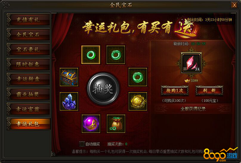 活动期间,每购买一次礼包可获得一次抽奖机会,还可花费元宝进行刷新!抽奖次数和礼包购买次数每日零点清零,请及时抽奖。