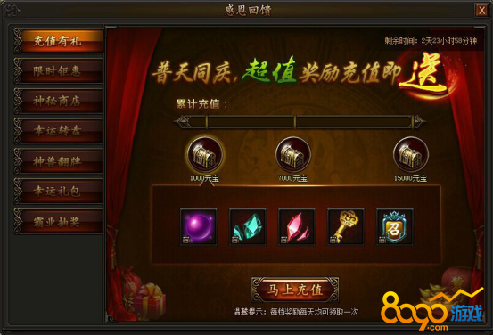 活动期间,充值元宝即可领取三档丰厚奖励,每天均可领取一次,不容错过!
