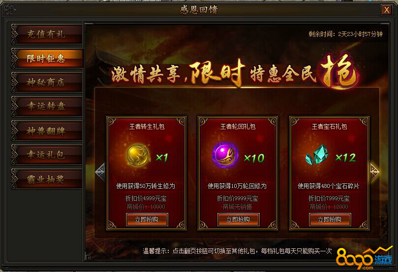 活动期间,转生、轮回、宝石、内功、羽毛和魂珠等材料礼包限时折扣,超低价格,不容错过!