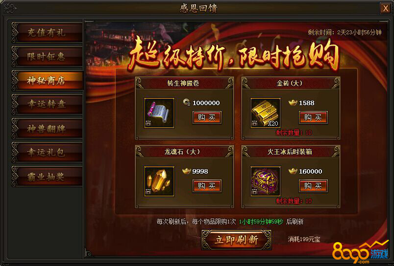 活动期间,每两小时神秘商店会自动刷新一批道具,也可花费元宝立即刷新,大量道具限时等你抢购。