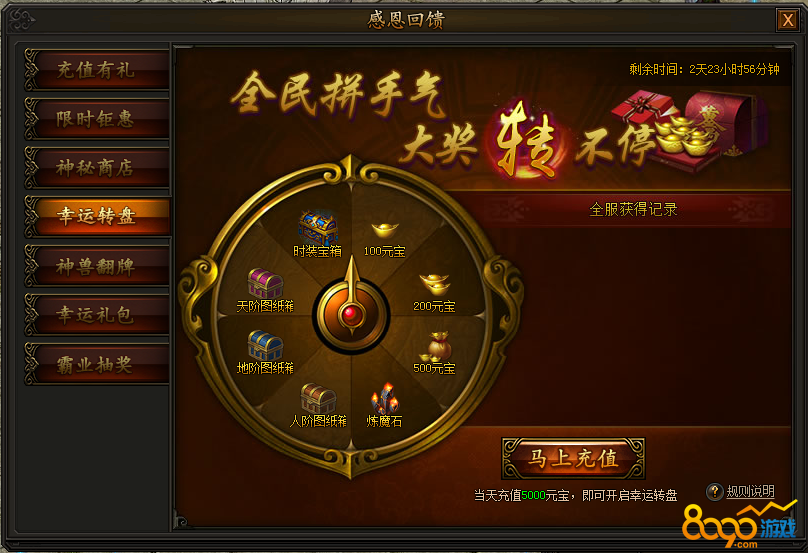 活动期间,充值并消费一定元宝即可使用幸运转盘,获得大量不绑定元宝返还,更有机会得到时装宝箱,获得珍稀时装奖励。