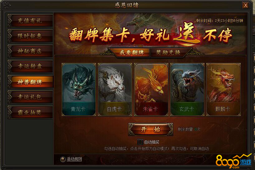 活动期间,每充值2000元宝,可获得一次翻牌机会,抽取一张卡片;集齐各类卡牌,可组合兑换不同档次的奖励。