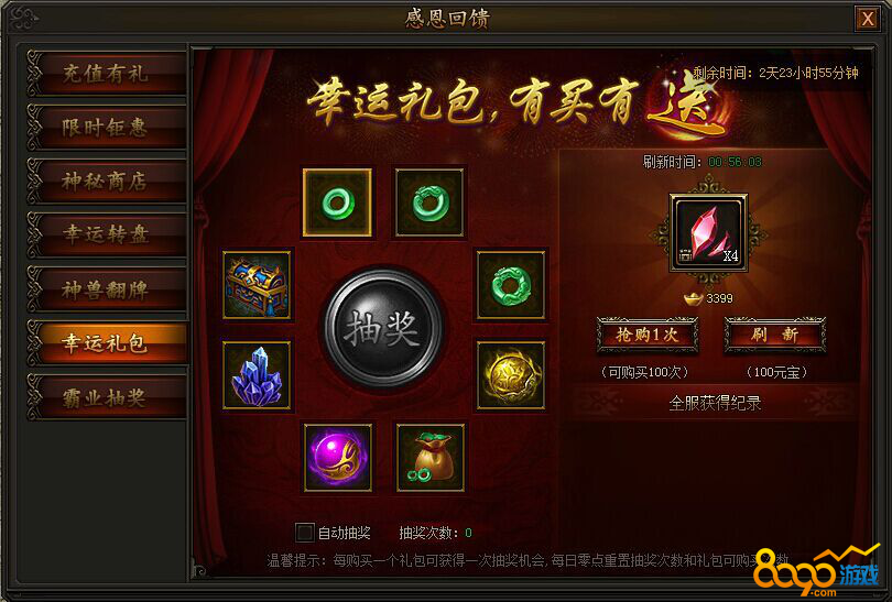 活动期间,每购买一次礼包可获得一次抽奖机会,还可花费元宝进行刷新!抽奖次数和礼包购买次数每日零点清零,请及时抽奖。