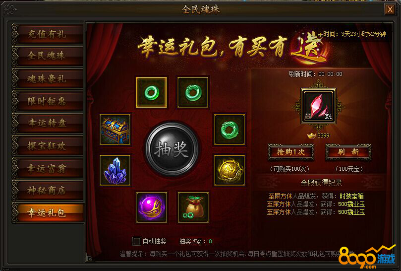 活动期间,每购买一次礼包可获得一次抽奖机会,还可花费元宝进行刷新!抽奖次数和礼包购买次数每日零点清零,请及时抽奖。