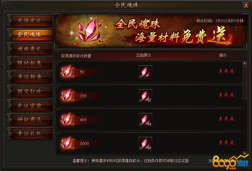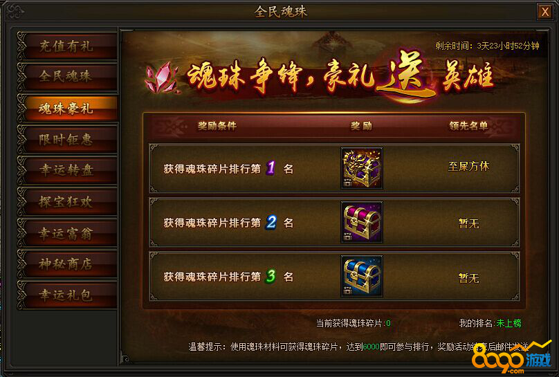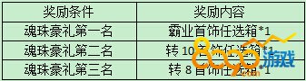 活动期间,使用魂珠碎片大、中、小材料获得魂珠碎片,获得碎片数目达到6000即可参与碎片获得排行,有机会获得霸业装备、极品首饰奖励!活动结束后,奖励通过邮件发送。