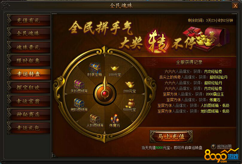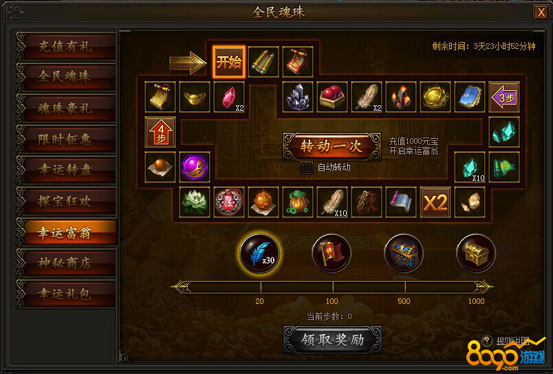 活动期间,充值一定元宝即可参与幸运大富翁,获得丢骰子次数,转动骰子即可获得踩中格子上的豪华奖励,多次参与累计步数,更有机会得到时装宝箱和极品转生装备奖励!