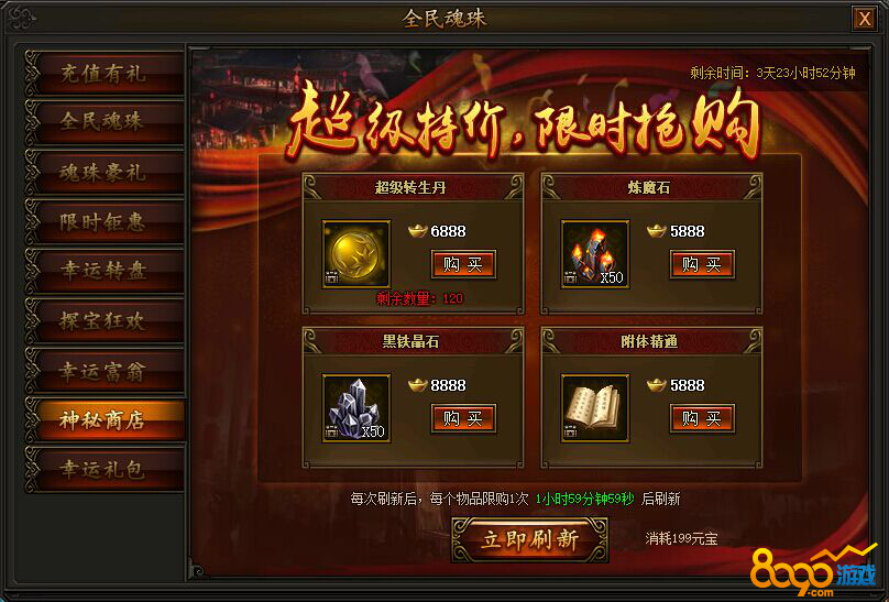 活动期间,每两小时神秘商店会自动刷新一批道具,也可花费元宝立即刷新,大量道具限时等你抢购。
