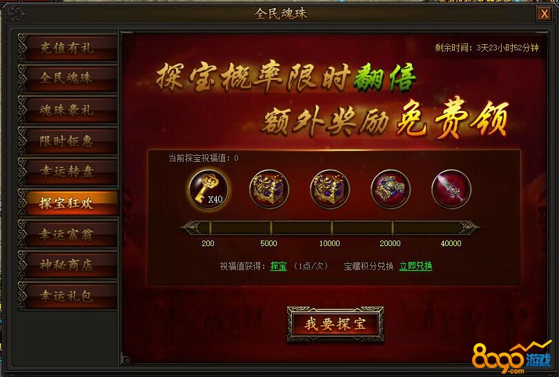 探宝超值回馈限时开启!活动期间探宝可获得祝福值,祝福值达到一定数值即可领取霸业装备奖励!