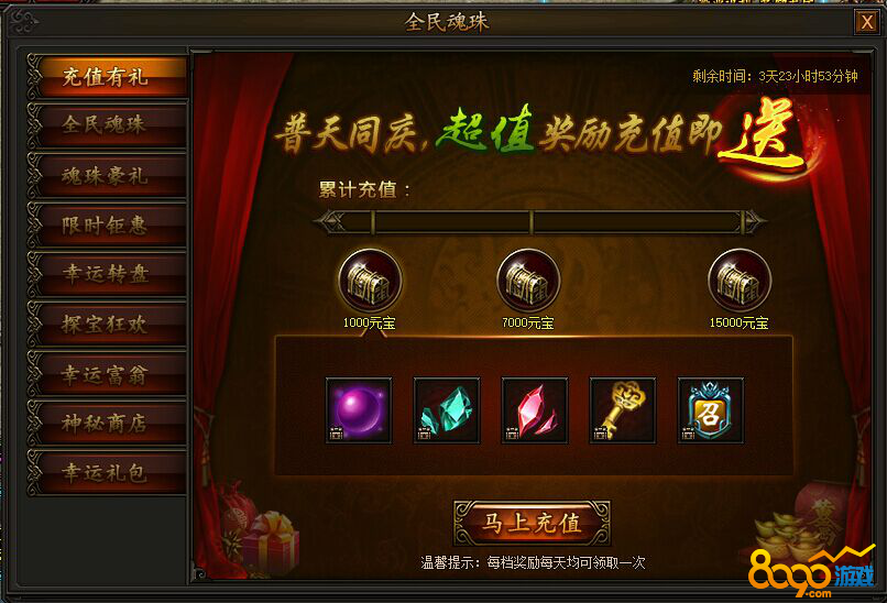活动期间,充值元宝即可领取三档丰厚奖励,每天均可领取一次,不容错过!