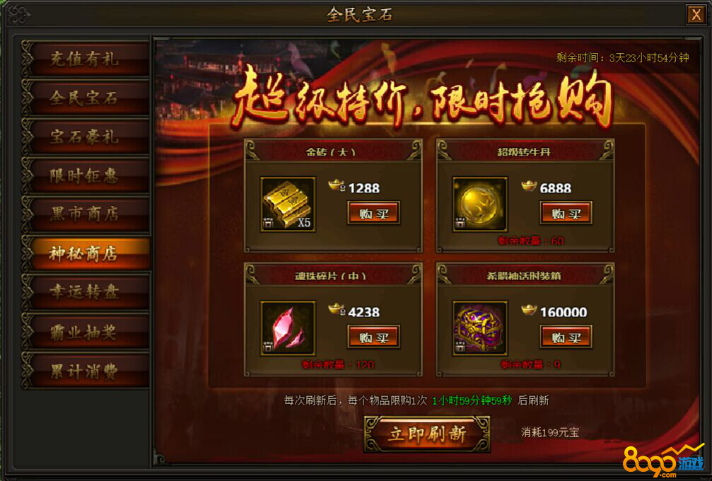 活动期间,每两小时神秘商店会自动刷新一批道具,也可花费元宝立即刷新,大量道具限时等你抢购,更有机会获得珍稀时装,机会不容错过。