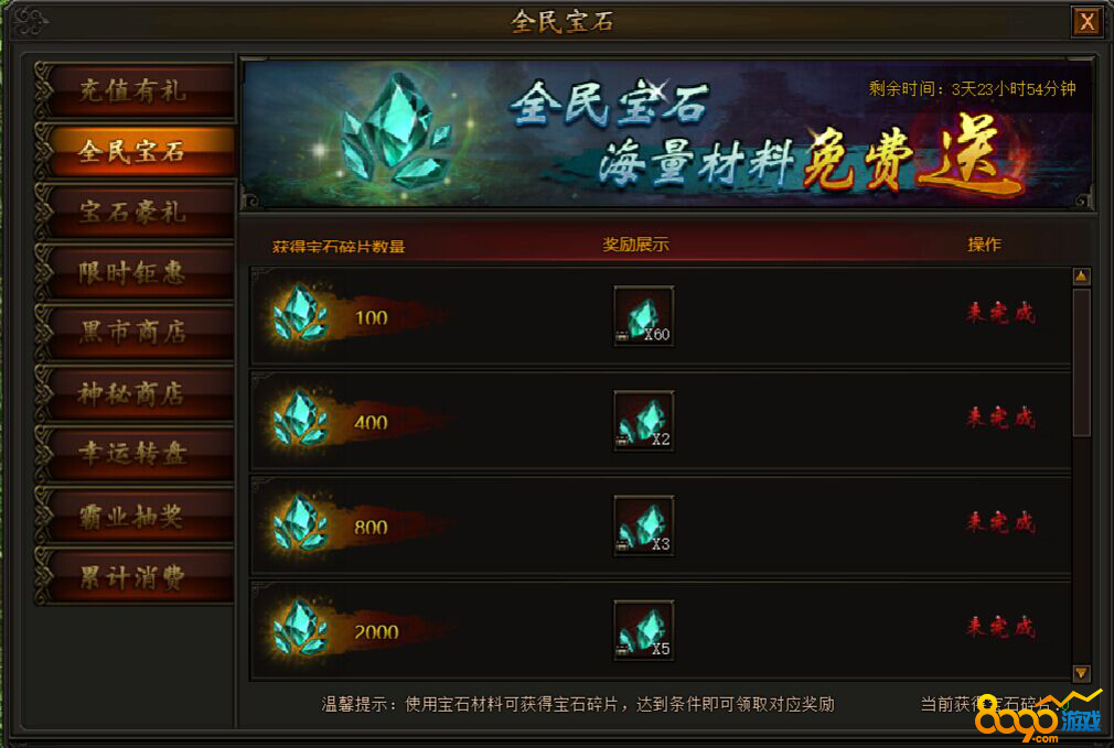 活动期间,使用宝石结晶大、中、小材料获得宝石碎片,获得的宝石碎片达到一定数量即可领取大量材料返还,获得碎片越多,返还材料越多,升级宝石事半功倍!