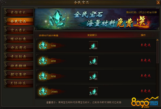 活动期间,使用宝石结晶大、中、小材料获得宝石碎片,获得的宝石碎片达到一定数量即可领取大量材料返还,获得碎片越多,返还材料越多,升级宝石事半功倍!