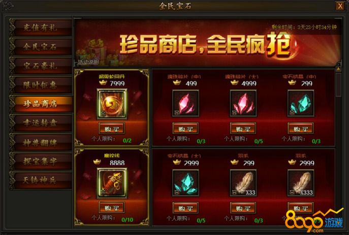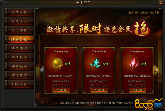 活动期间,转生、宝石、魂珠、内功、BOSS积分和轮回等材料礼包限时折扣,超低价格,不容错过!
