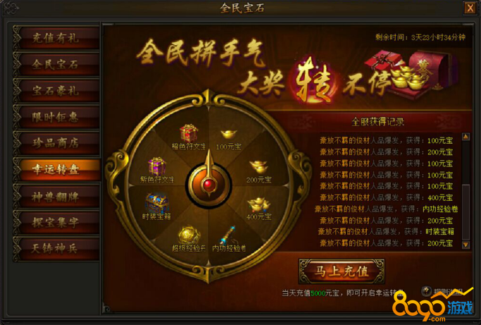 活动期间,充值并消费一定元宝即可使用幸运转盘,获得大量元宝和材料道具,更有机会获得珍稀时装宝箱,精彩不容错过。
