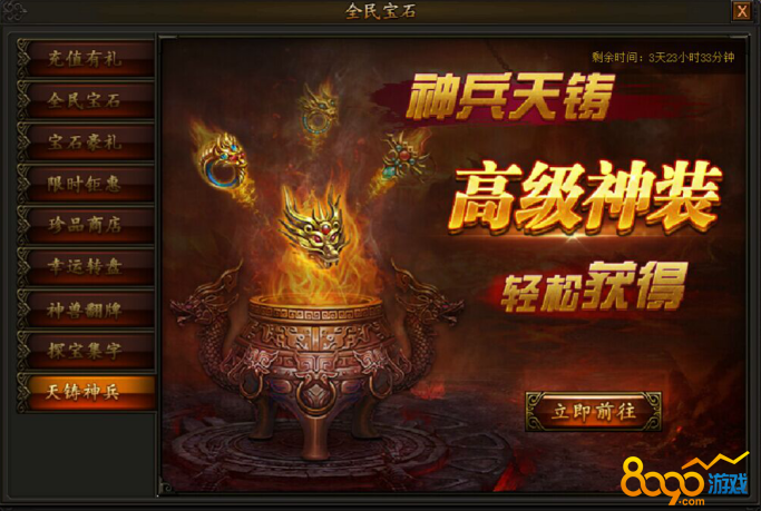 活动期间,天铸神兵限时出现在比奇城,投入低级神装,花费少量元宝即有机会获得更高级神装,从此快人一步,集齐高阶神装不是梦!
