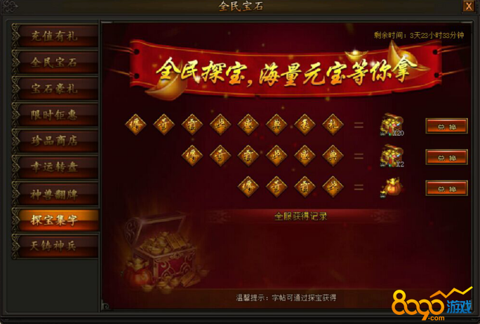 活动期间,探宝可能获得“传奇霸业盛典豪礼”字帖,集齐字帖可兑换海量不绑定元宝奖励!