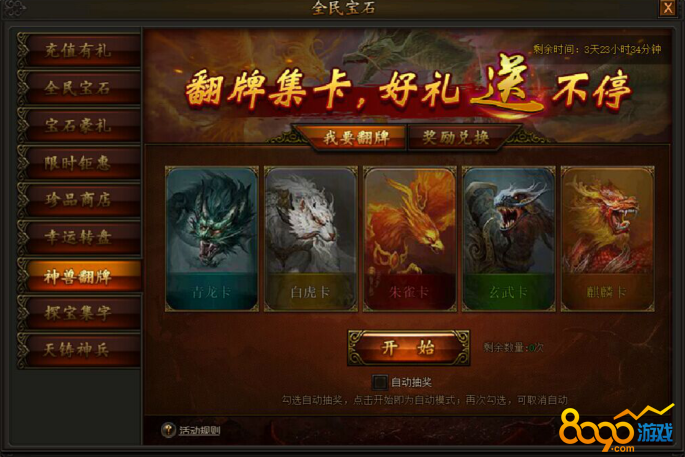 活动期间,每充值2000元宝,可获得一次翻牌机会,抽取一张卡片;集齐各类卡牌,可组合兑换不同档次的奖励。
