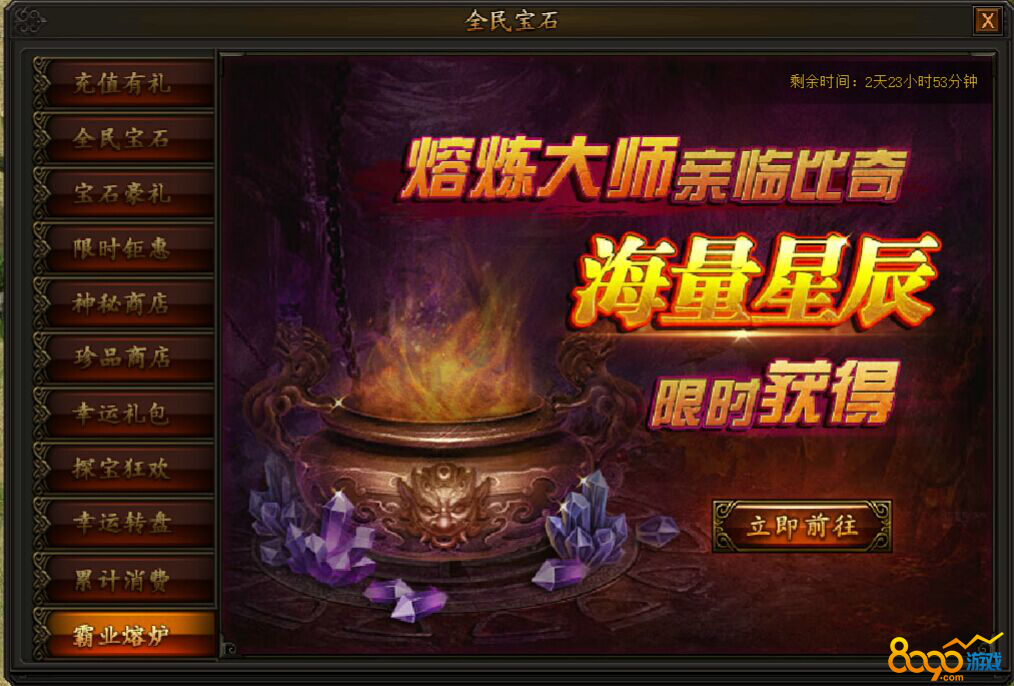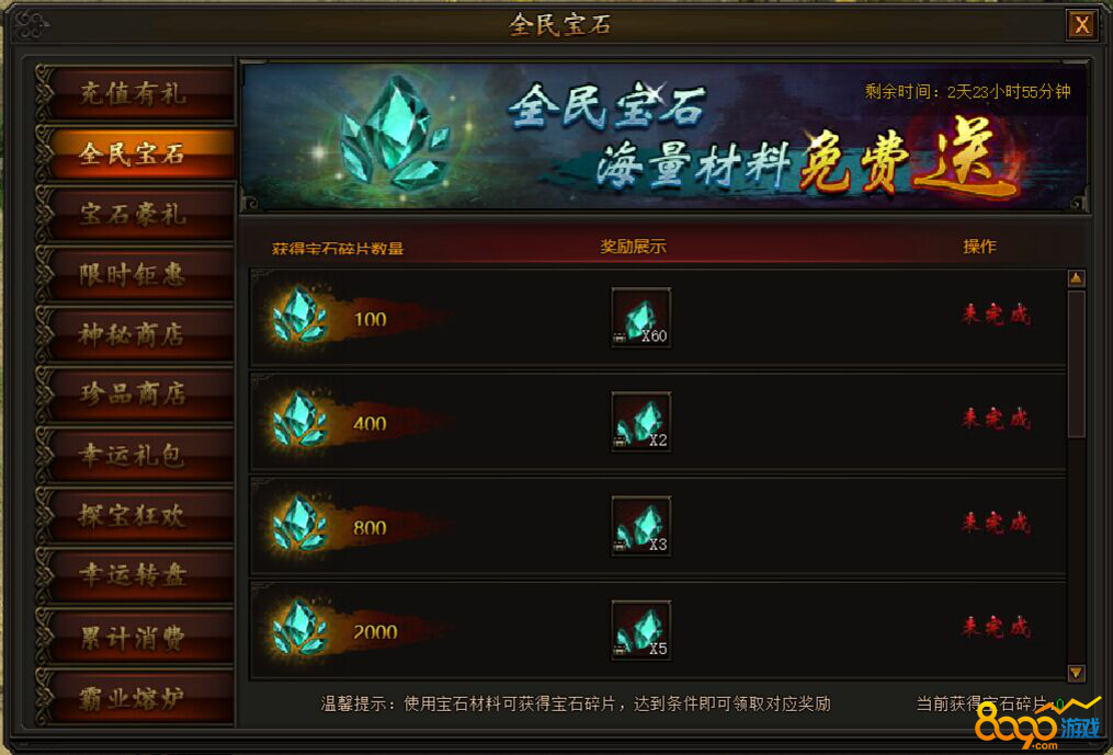 活动期间,使用宝石结晶大、中、小材料获得宝石碎片,获得碎片数目达到8000即可参与碎片获得排行,有机会获得霸业装备、极品首饰奖励!活动结束后,奖励通过邮件发送。