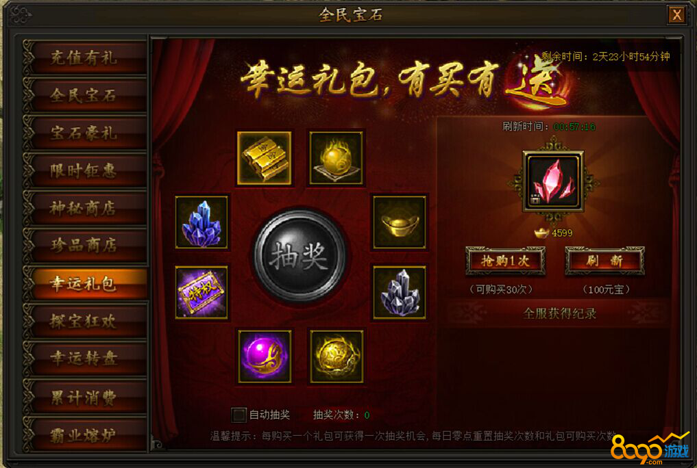 活动期间,每购买一次礼包可获得一次抽奖机会,还可花费元宝进行刷新!抽奖次数和礼包购买次数每日零点清零,请及时抽奖。
