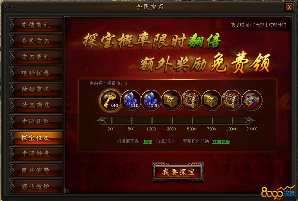探宝超值回馈限时开启!活动期间探宝可获得祝福值,祝福值达到一定数值即可领取霸业装备奖励!
