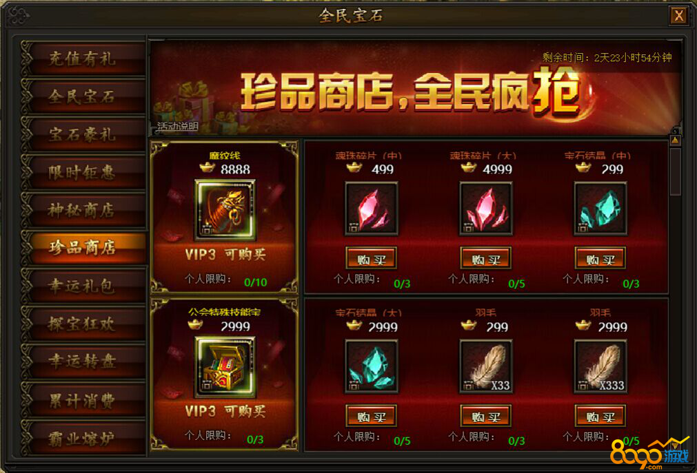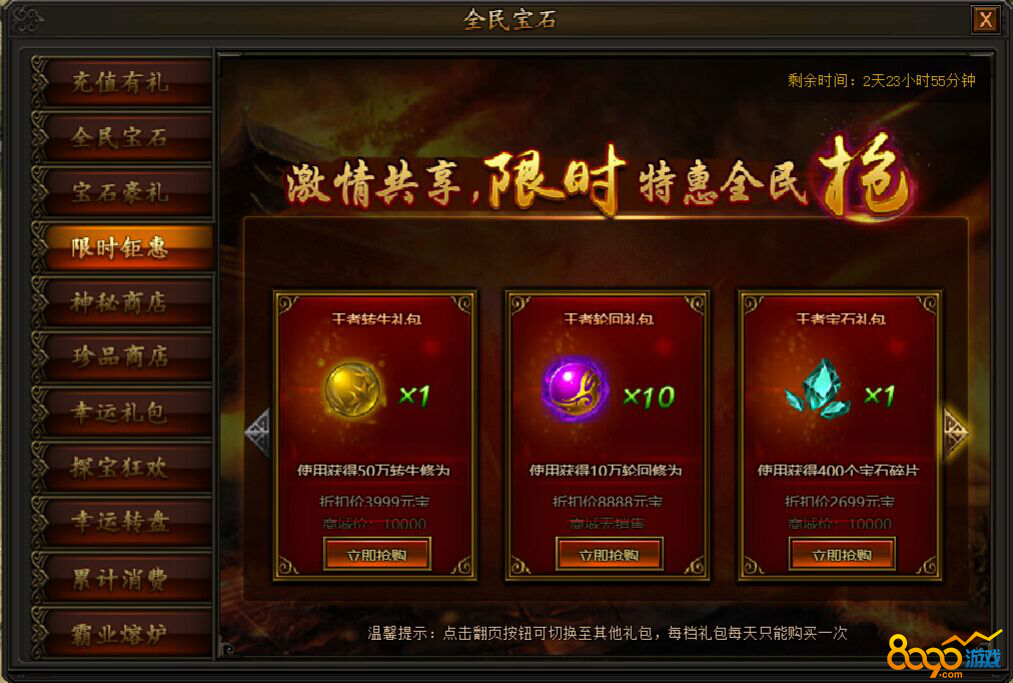 活动期间,每天会随机刷新一批特价道具,花费少量元宝即可购买,每个道具均有每天最大个人购买次数限制,部分道具有购买vip等级限制,买到就是赚到,机会不容错过!