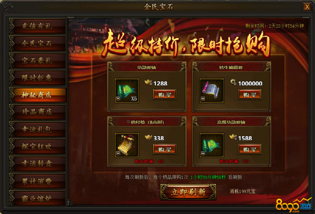 活动期间,每两小时神秘商店会自动刷新一批道具,也可花费元宝立即刷新,大量道具限时等你抢购。