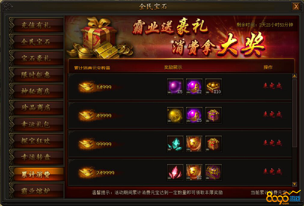 活动期间,累计消费一定数量元宝,即可领取对应档奖励,每个角色只能领取一次。