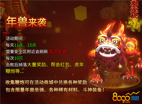 2、每天11点、22点刷新,年兽停留2小时,活动结束,如果玩家没有击败年兽,那么剩余的年兽会消失离去