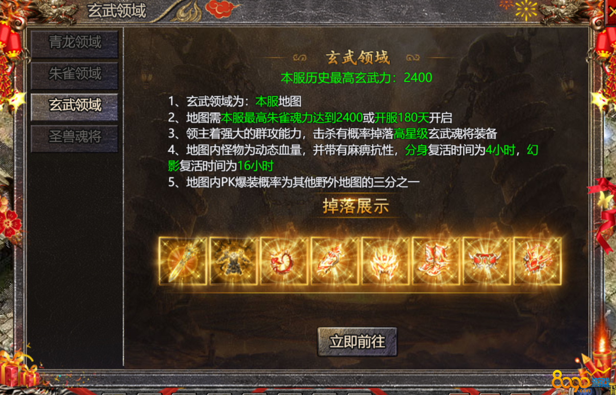 2、地图需本服最高朱雀魂力达到2400或开服180天开启