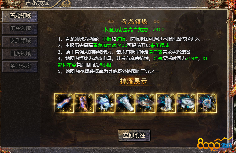 1、青龙领域分两层:本服和跨服,跨服地图可通过本服地图传送进入
