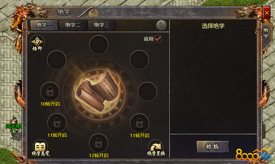 5、绝学烙印界面点击修炼槽中绝学可锁定绝学,锁定后在修炼新绝学时不会被替换