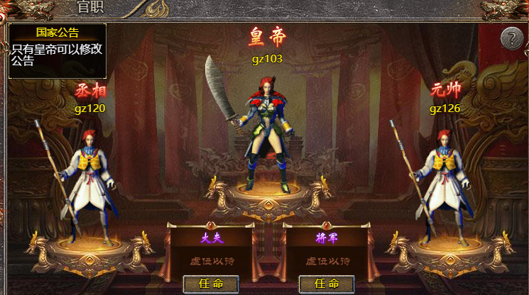 3、皇帝、丞相、元帅由每个国家攻击力最高的3个人当选,由系统每日0点自动分