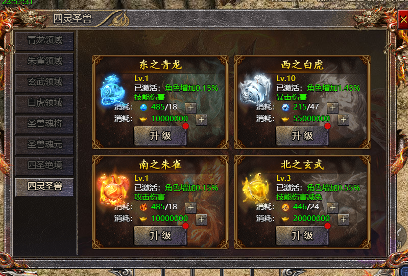 3、圣兽升级的材料可通过击杀四灵守卫获得