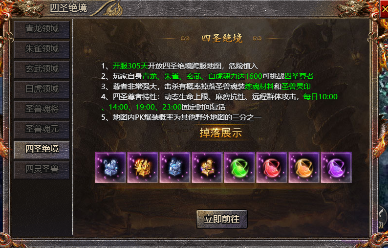 1、四灵圣域为跨服地图,可通过四圣绝境-四灵圣域【跨服】进入
