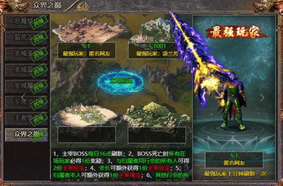 2、【众界之巅】内含有4字BOSS,每日16点刷新,击杀后可获得主宰秘宝和主宰瑰宝