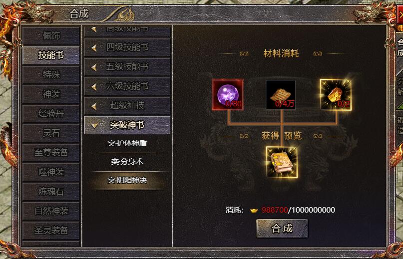 1、开服50天后,可在【合成-技能书】处合成技能突破材料
