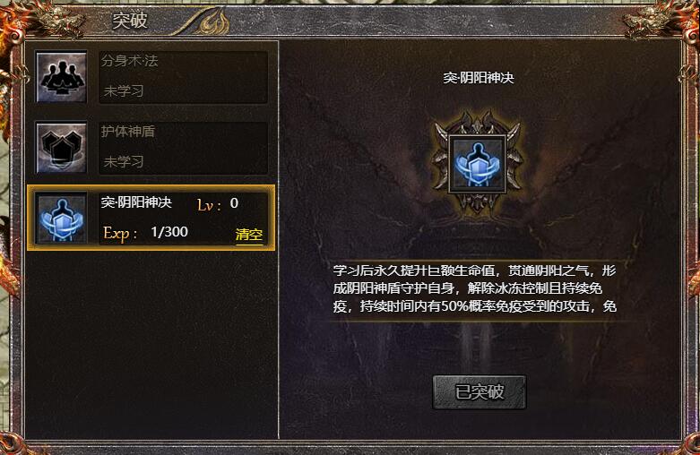 2、玩家等级达到10级后可在【庄园-神技大师】处突破技能阴阳神决